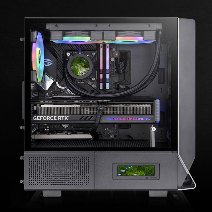 3.9吋LCD显示器可用TT RGB Plus 2.0 软件操控,不但能显示系统实时信息、时间以及当地天气,也能上传各种图像或GIF档,为机箱增添个人风格。搭配同样具有LCD 显示器的散热配件,可达成与显示器相互连动,加强沉浸式体验。