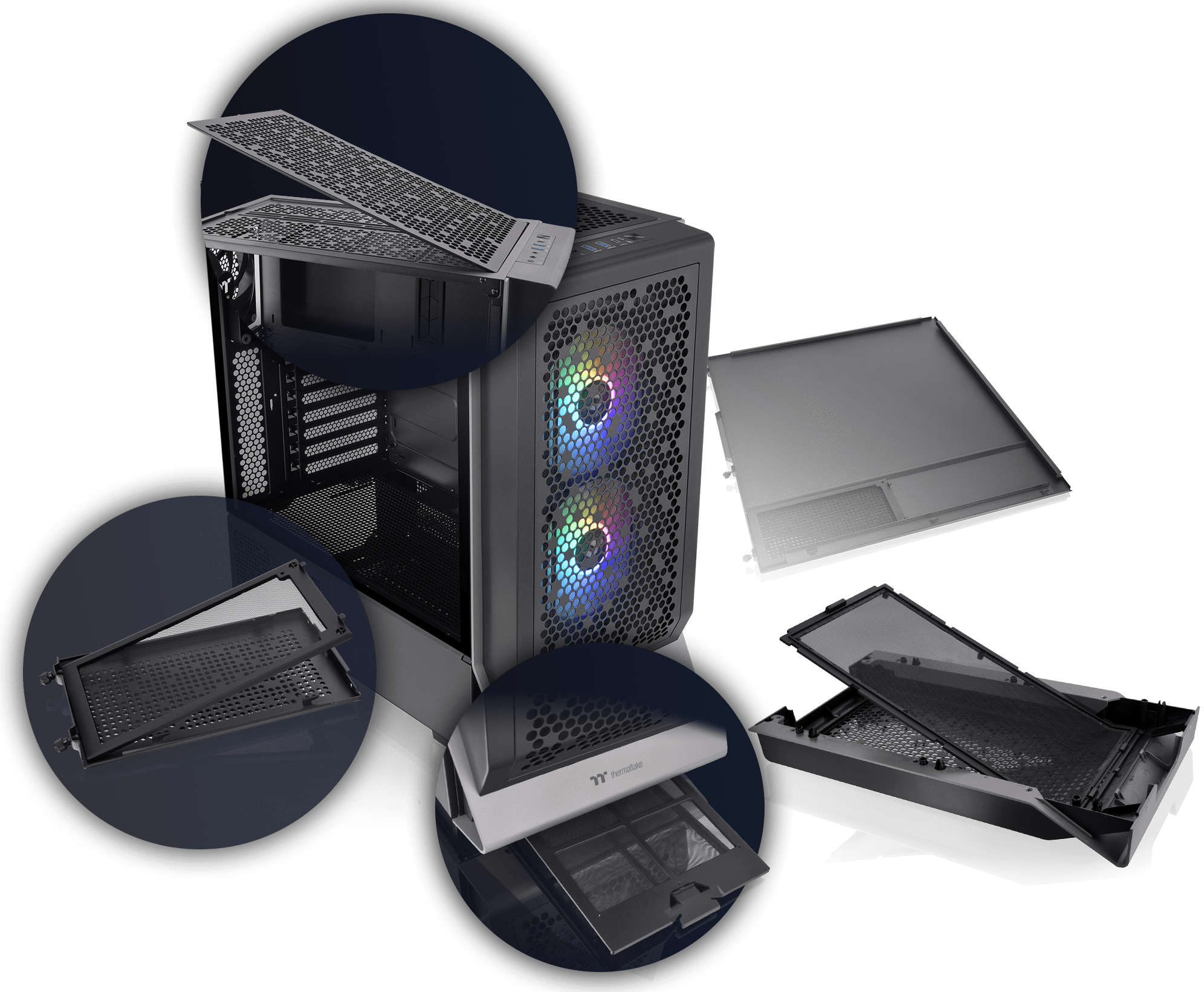 劲透Ceres 300 TG ARGB中直立式机箱上方、前方、下方、左侧和右侧配有易于拆卸的滤网,能有效防止灰尘污垢进入,提供优异的防尘保护。
